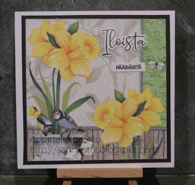 Näissä korteissa kuvat ovat serveteistä. Mustalla reunustetuissa narsissikorteissa kokeilin ensimmäistä kertaa liimaharsoa servetin kiinnitykseen. Muut on tehty laminoimalla.
